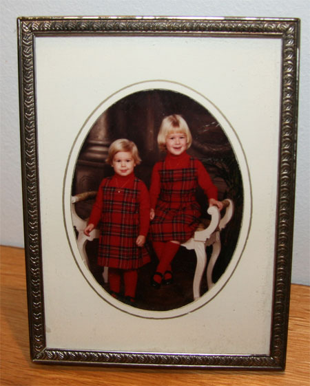 Det är jag och min syster när vi var sisådär 3 och 5 år gamla. Mamma klädde oss oftast i likadana kläder och de flesta hade hon sytt själv. Visst är vi söta i våra skottsrutiga klänningar, röda polotröjor, knästrumpor och lackskor?