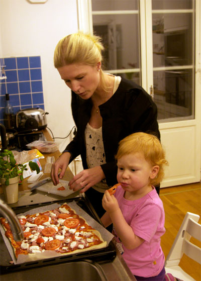 Olivia och jag gör pizza. Som vanligt är det någon som vil äta av fyllningen innan pizzan är klar 🙂