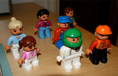 En arme av lego-gubbar. Det finns till och med en liten bäbis-lego-gubbe som just nu sover med Olivia i sängen.