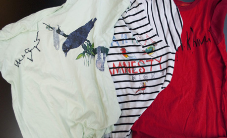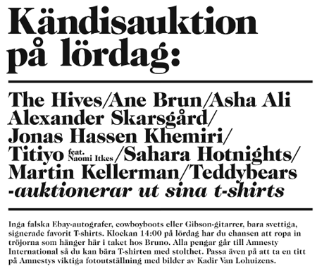 På lördag (17 april) kl. 14 arrangeras det en välgörenhetsaktion i Brunogallerian där alla intäkter går till Ammesty International. Kändisar som Titio, Alexander Skarsgård, The Hives mfl aktionerar ut signerade t-shirts.