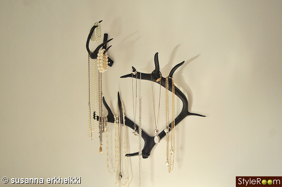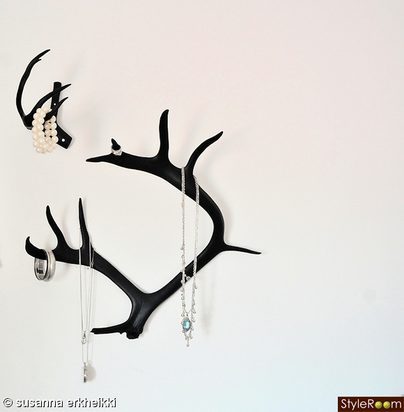 Det här renhornet som Susanna målat svart och satt upp på väggen som smyckeshängare är en favorit.