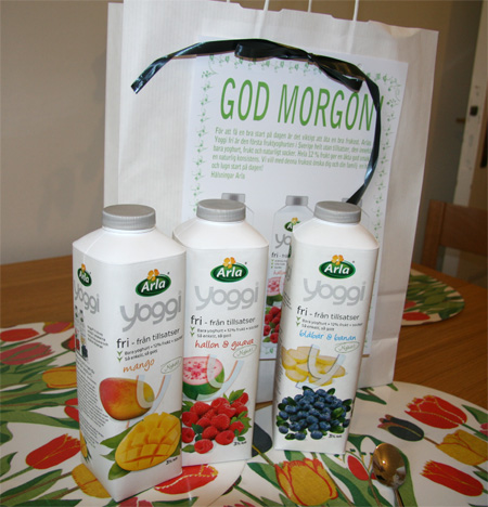 I början på veckan fick vi frukost levererad till dörren. Det är Arla Yoggi som släppt en ny yoghurtserie som, Arla Yoggi fri, som är helt utan tillsatser. Produkterna innehåller endast yoghurt, frukt och naturligt socker.