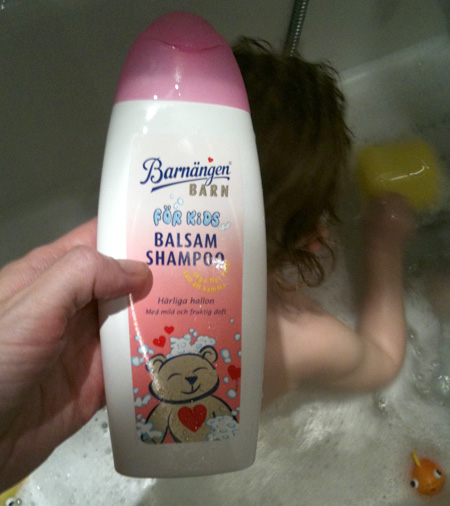 Barnängens balsamshampoo är en favorit, både hos Olivia och mig. Olivia gillar att färgen är knallrosa innan det blir lödder och att den luktar hallon. Jag gillar att den innehåller balsam så den reder ut Olivias toviga hår.