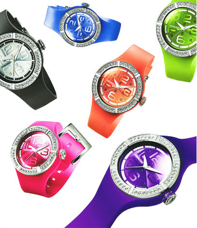 Dyrberg/Kern satsar också på färglada gummi-klockor. Men här får man också 42 Swarovski-kristaller. Kollektionen heter Glamoura och klockorna kostar 1299 kr.