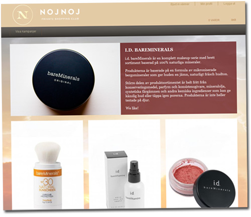 Det har dykt upp en ny shoppingclub-sajt som heter NojNoj. Just nu har de bra erbjudande på i.d. bareMinerals, Orrefors och Sandqvist. Precis som Campadre så bjuder NojNoj på bra produkter till lägre pris under en kort period.