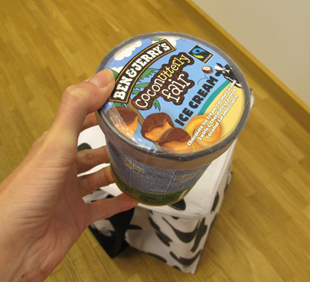 Idag fick jag glass levererad till jobbet. Ben & Jerrys nya smak Coconutterly Fair som innehåller chokladglass, kokoskolasås och chokladknäck. Den var faktiskt riktigt god (skriver faktiskt för att jag vanligtvis inte gillar glass med nötter, kakdeg mm) och den fick tummen upp av mina jobbarkompisar också.