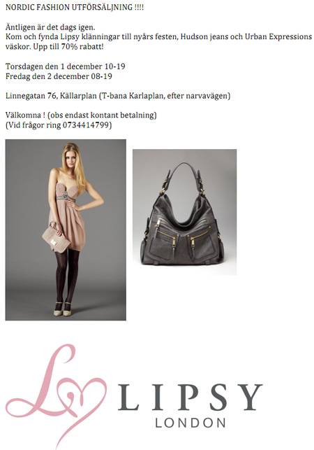 Jag har fyllt på med fler utförsäljningar sedan inlägget tidigare i veckan. Lipsy, J Lindeberg och tydligen har VILA utförsäljning på Tvålpalatset i helgen också.