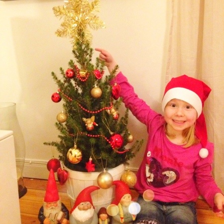 Eftersom vi åker norröver för att fira jul så har vi börjat med julstöket tidigt. Jag hade bestämt att det inte skulle bli någon gran i år men när jag hittade en liten söt på Ikea (med en fin korg till) så kunde jag inte låta bli. Nu har Olivia klätt den och passade på att prova tomteluvan samtidigt 🙂