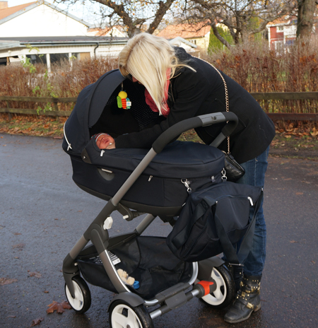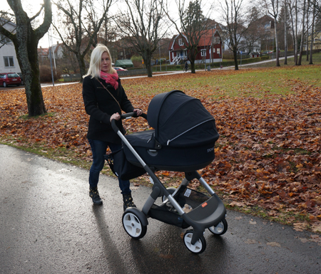 Redan samma dag som vi kom hem från BB tog vi en kort promenad med nya vagnen. Det är en mörkblå Stokke Crusi. Tidigare har jag haft en Teutonia Fun och en Bugaboo Bee och om man jämför med dessa vagnar så gillar jag verkligen att Stokke Crusi är så hög. Du slipper böja dig ner så långt och du får bättre kontakt med barnet. Dessutom har du massor med plats under vagnen vilket jag verkligen saknade på Bugaboo Bee.