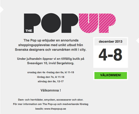 “Karin Säby, Ballerina Closet och Sofia Weman Design är några av de närmare 15 svenska designers som inför jul går ihop och öppnar The Pop Up, en annorlunda shoppingupplevelse mitt bland de stora kedjorna. Här finner du ett unikt utbud av dam- och herrkläder, smycken, accessoarer och skor från nya och etablerade svenska varumärken.