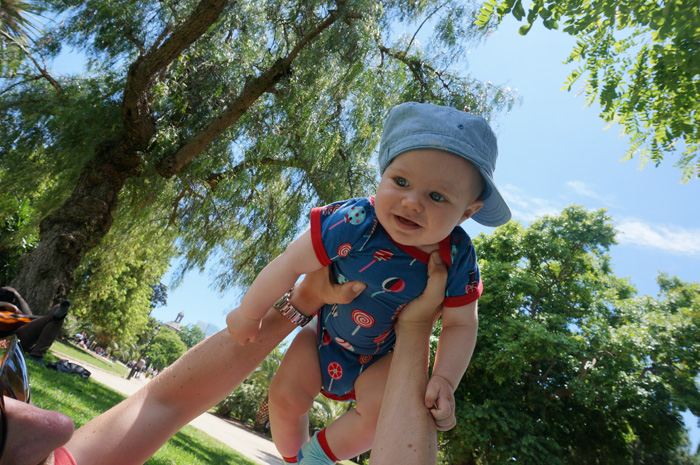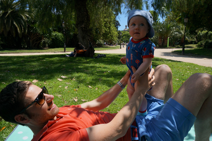 Men i parken kunde han leka på filten (ett bra tips är att alltid ta med en picknick-filt när du reser med småbarn) och öva sig på att stå på alla fyra i krypläge.
