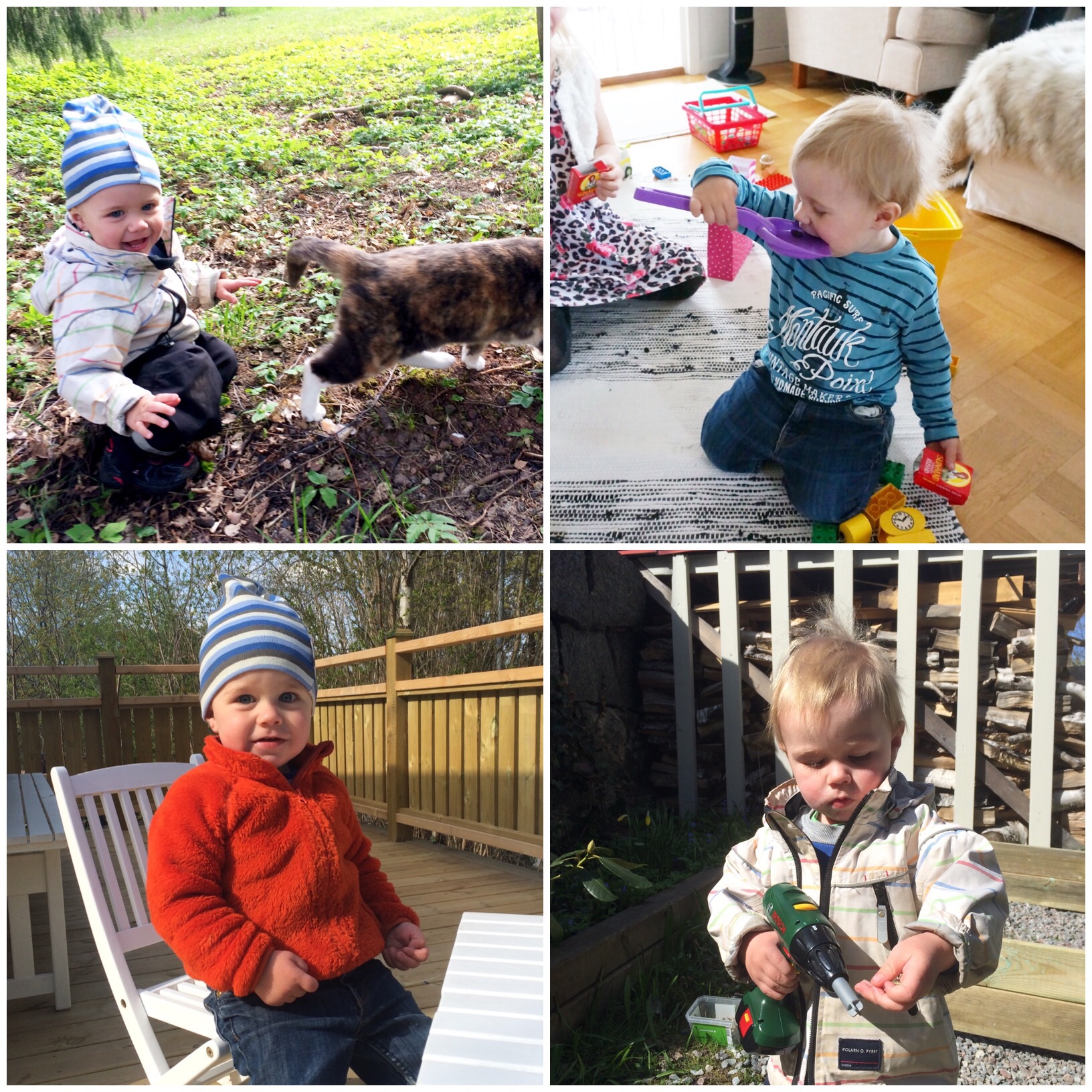 Att få hjälpa pappa att snickra och skruva är allra roligast samt att samla regnvatten i hinken och blöta ner sig. Grannarna har hundar och katter som hälsar på så det är alltid något spännande som händer i vårt mysiga kvarter.