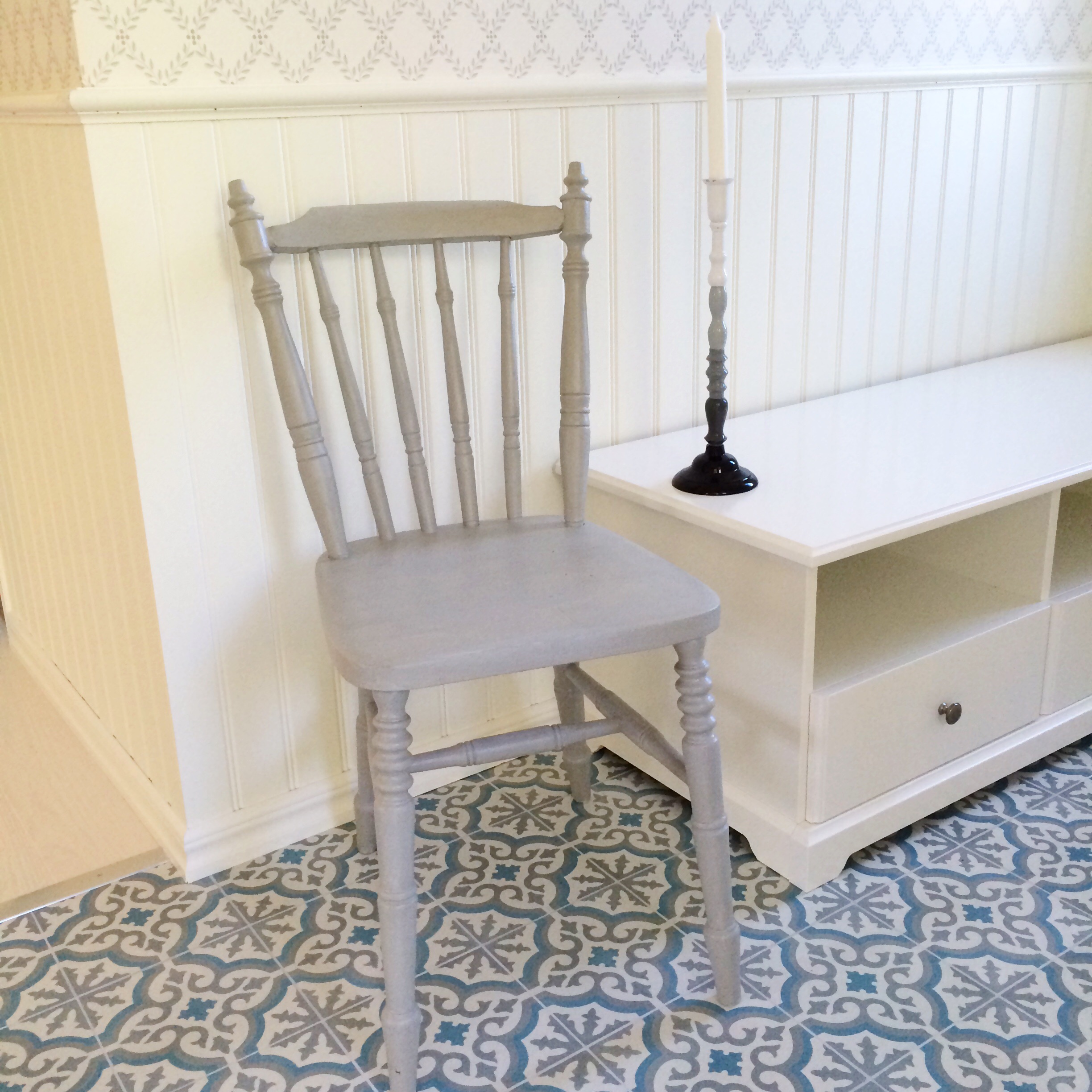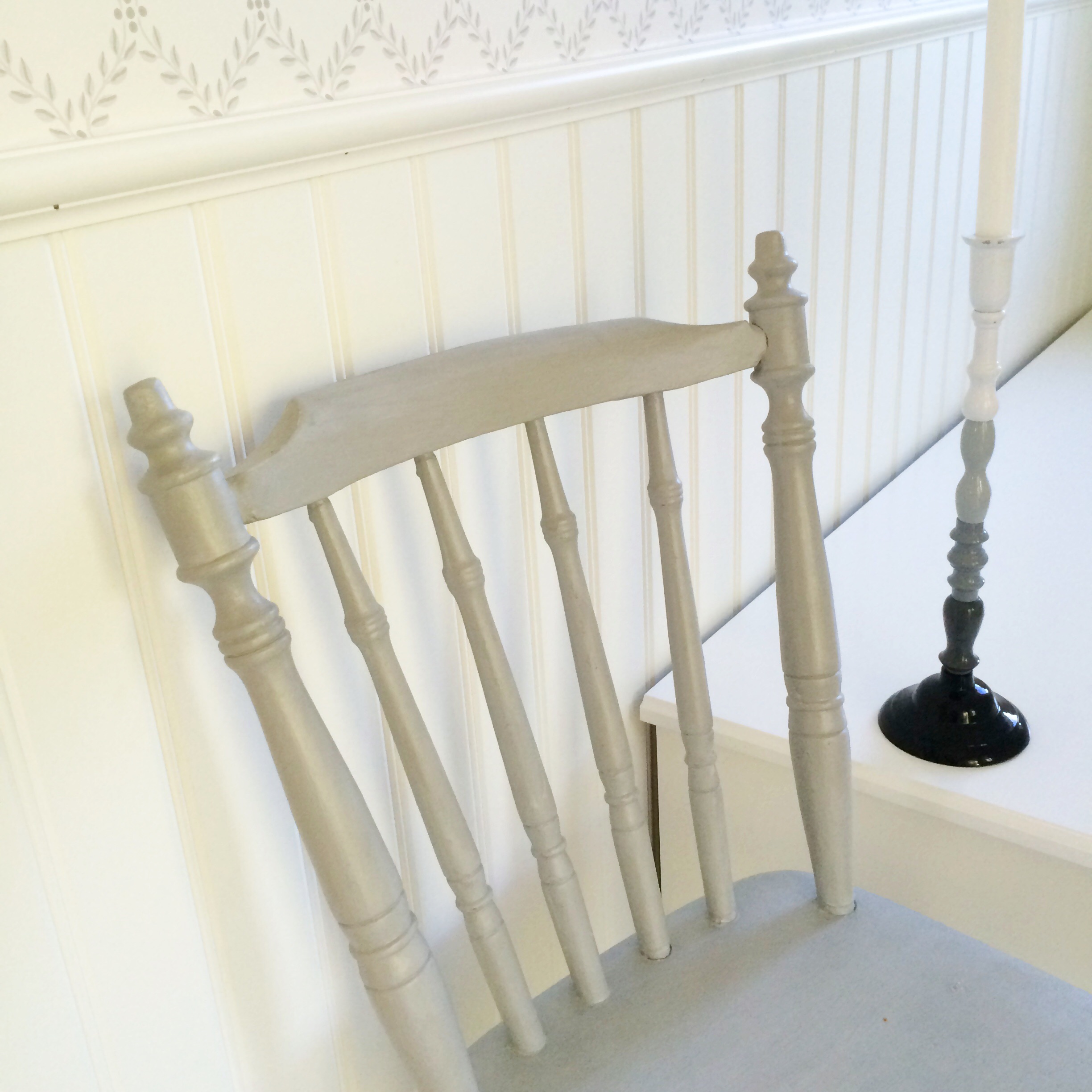Efter besöket hos Lina har jag hunnit måla Ellas vagga (tyvärr inga bilder på den än) och en pinnstol. Det är fantastiskt kul att bara börja måla och slippa allt förarbete. Här kommer före och efter bilder på stolen som målats i färgen Paris Grey.