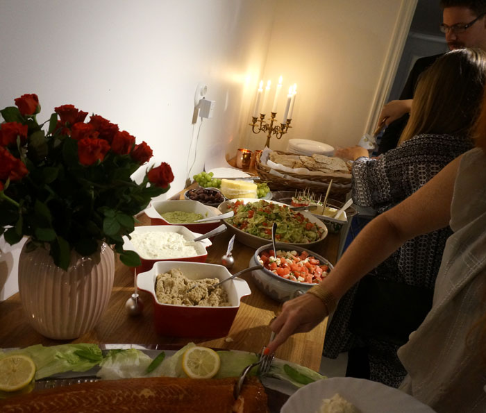 Vi fick massor av hjälp av mina föräldrar som är på besök vilket vi är mycket tacksamma för. På så sätt fick vi mer tid att umgås med gästerna. Men jag har väldigt svårt att slappna av när jag vet att det ligger två småttigar och sover på övervåningen så det blev några turer för att kolla till att de mådde bra 🙂