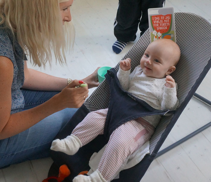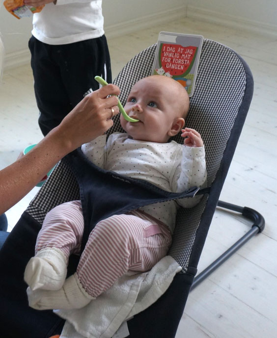 Idag fick Ella sin första smakportion. Hon har länge tittat nyfiken på när jag äter och nu var det äntligen dags att prova själv. På menyn stod palsternacka och det fick tummen upp. Hon mumsade i sig flera skedar och det kan jag inte komma ihåg att varken Olivia och Hjalmar gjorde första gången.