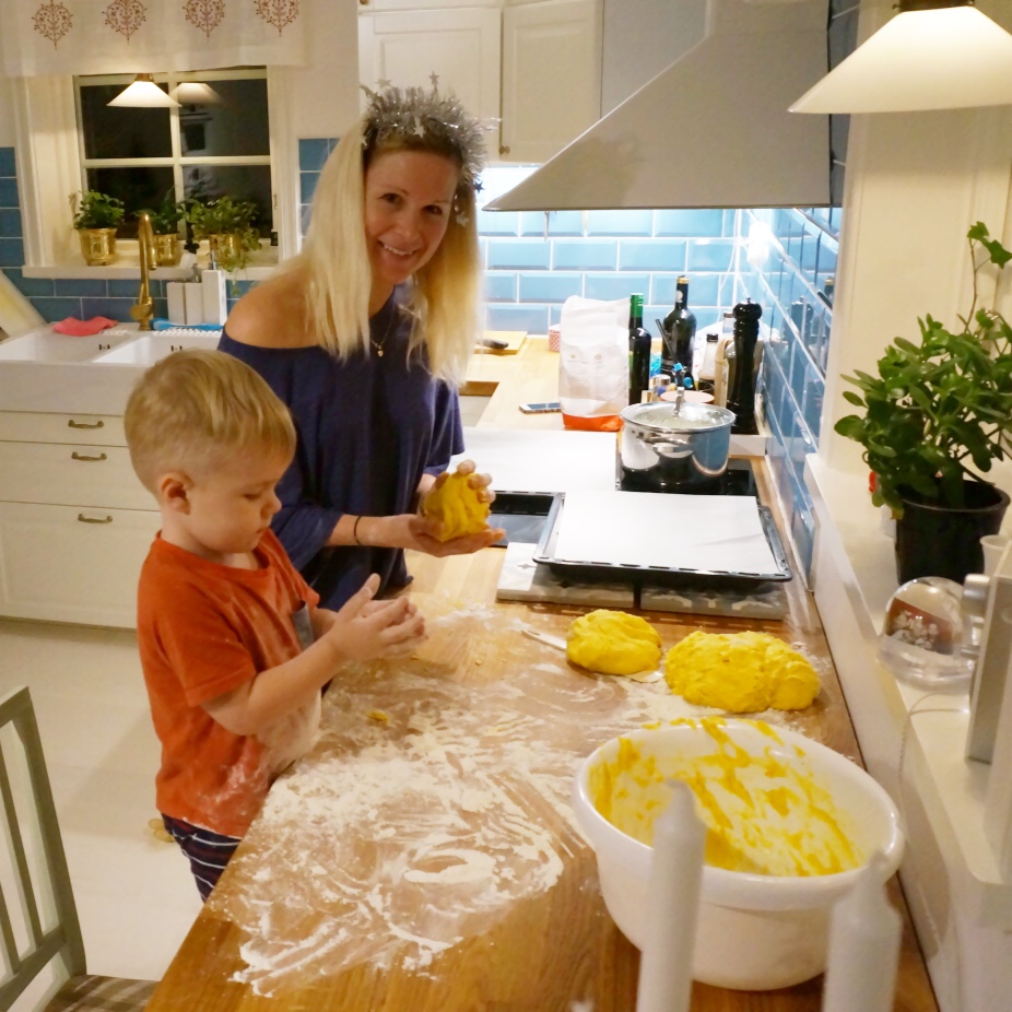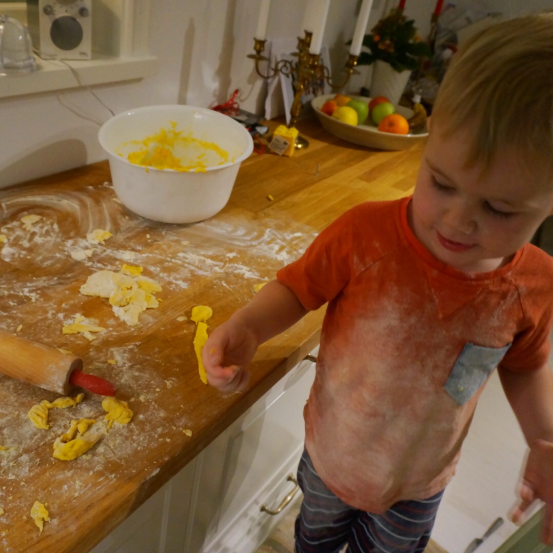 Idag har Hjalmar och jag bakat lussebullar. För någon som har lite kontrollbehov och inte gillar kladd var det ganska tufft att stå där brevid någon som badade i mjöl och kastade runt deg 🙂 Men min lilla bagare tyckte det var så kul och sysselsatte sig hela tiden jag stod och kringlade lussekatter.