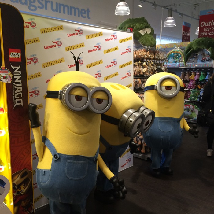 I lördags hängde Hjalmar och jag med de här söta gula figurerna på Lekmers butik i Barkarby. Minioner dök först upp i Dumma mej-filmerna men i somras fick de en egen film som heter Minions.