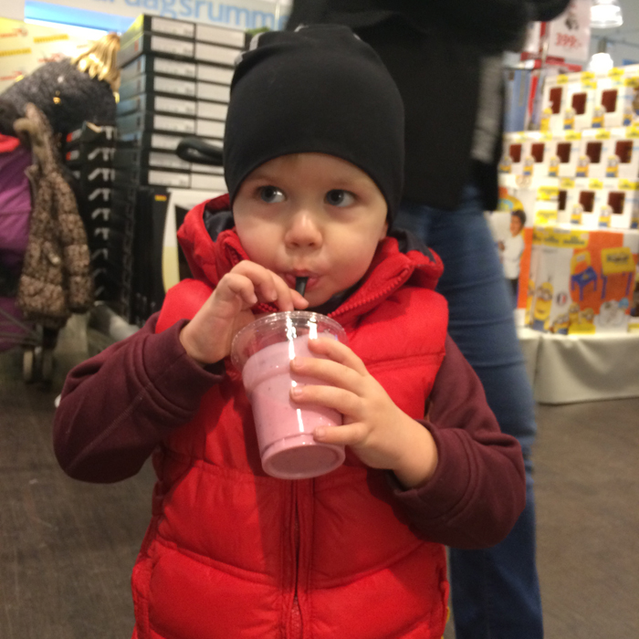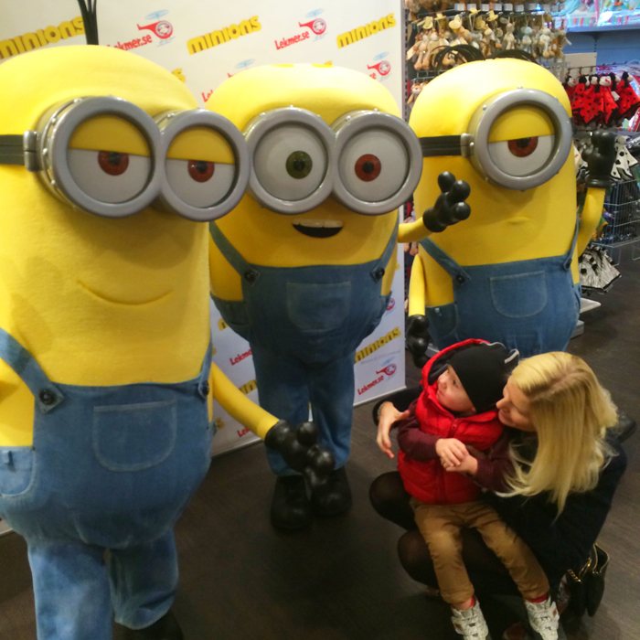Hjalmar ville inte hälsa på Minionerna och när vi skulle ta bilden tillsammans med dem så fick jag hålla fast honom 🙂 Men det bjöds på smoothies och det och alla leksaker i butiken lockade mer än att stå still med mamma och lyssna på en presentation.